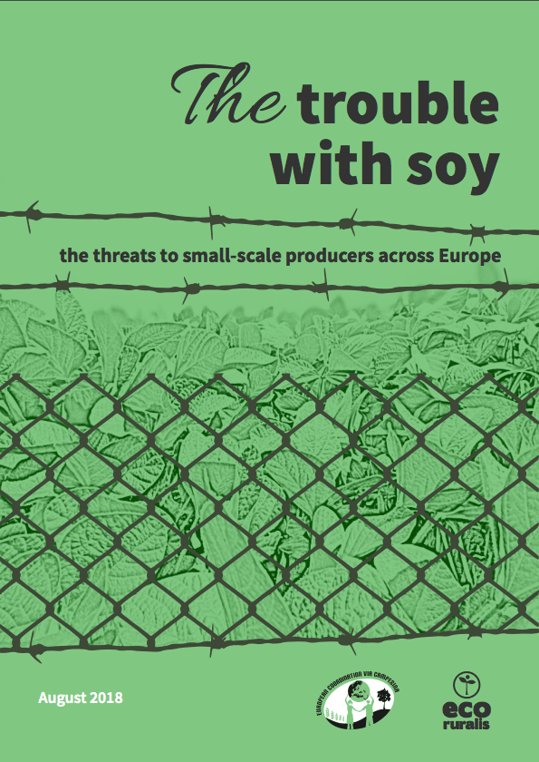 The trouble with soy: the threats to small-scale producers across Europe is a 2018 report by Eco Ruralis and the European Coordination Via Campesina, which deals with recent EU activity on the topic of ‘protein independence’. Whilst there has been a focus on marketing the sustainability of European plans to encourage the uptake of soybean and other protein crop production, the report finds that such schemes pose little challenge to the status quo of corporate-led industrial agriculture.